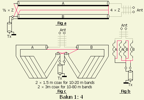 Goed bruikbaar is de autotransformator van de antenne in de plaats van de impedantietransformator in de eerste figuur b. De kant van de magmetische balun die normaal aan de afscherming is verbonden komt nu aan de tegencapaciteit of "aarde".