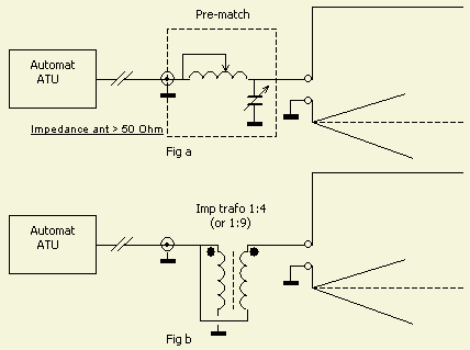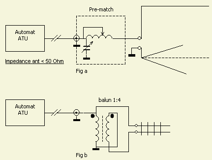 Als de antenne een impedantie heeft die lager is dan 50 Ω wordt een pre-match tuner geschakeld volgens figuur a, («fig) de condensator komt aan de ingangszijde. Ook het voeden van een openlijn (Fig b) is mogelijk door middel van een 1 : 4 balun. De secundaire winding moet als ket kan een voldoende hoge impedantie hebben ten opzichte van de impedantie aan het begin van de open lijn, lees eventueel daarover in balun. Dat geldt ook voor het systeem van figuur b in de eerste plaatje.