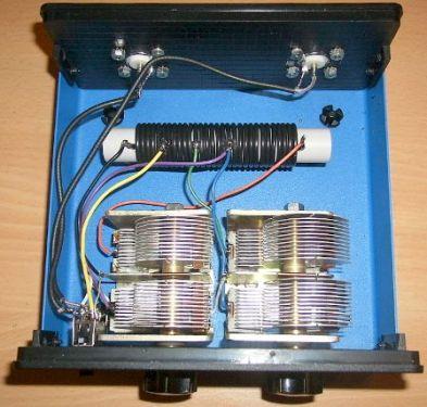 The operation of the coil is rather complex. Most bands are tuned by windings to the second tap. The complete coil are for 80 m and 20 m. The twin variable capacitor plays an important for tuning the 20 m band and usually two matches can be obtained on that band. Choose the point where the capacitor has the largest capacitance. With the capacitor almost at minimum capacitance the 40 m and 10 m band are covered.