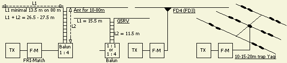 Antennas such as G5RV with balun, W3DZZ, FD3 and FD4, trap verticals and Yagis can be easily adjusted with a FRI Match. If you make an FD3 or FD4 yourself and use this tuner, you can as well place a 1 ÷ 4 balun with good results. That can be made yourself with a toroidal core, but better is a coax balun possibly a smaller model with a thin coax cable according to this article balun. The balun mentioned can also be used for feeding an antenna with an open line.