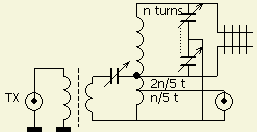 In practical use this tuner adjusts more than originally intended. It is just a matter of playing with both capacitors or connections. You have to find out and experience for yourself. An example of how it is possible is the adaptation of a wire antenna as shown opposite. The tap with the best adjustment must be determined experimentally. If you always use the same antenna, it only needs to be done once. It is also possible that an adjustment is successful by connecting the antenna directly to one of the taps.
