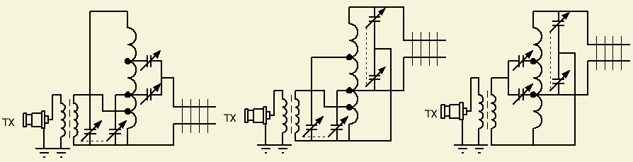 After experimentation with various antennas and complex loads, one 5 - 8 µH coil turns out to be the best tuning system for 10 to 80 m. The efficiency of the tuner is good, because it can be considered as an auto transformer with inductive and capacitive taps on the coil. Originally the design was a three knobs tuner (the left model). The results of further experiments were the middle and right model (with two knobs). The twin varicap has almost the same effect as the switched capacitor at the input of the left model. So a switch could be saved.