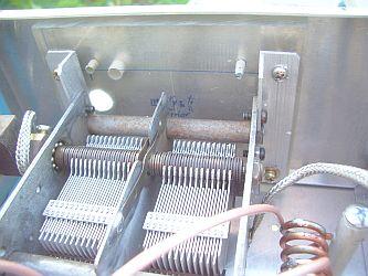 | the rotors of my tuning gangs are positively grounded to frame by rotary straps. the insulator block adapts the 3/8 inch rotor shaft to 1/4 inch for front panel knob. | gang mounted on perspex plate | original brass wiper was just riveted to frame |