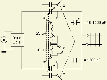 Het rendement van mijn beste type A3 tuner, werd o.a. met deze (fig») testopstelling vastgesteld. Bij de meeste andere ATU's zal het rendement bij dezelfde meetmethode slechts 85 - 90 % zijn. Een ATU volgens type A3 is beschreven in Efficiente symmetrische ATU