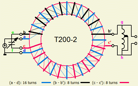 De balun wordt gemaakt met Teflon geïsoleerd draad op een rode T200-2 ringkern (groter type kan ook). Breng 16 windingen (a - d) en twee maal 8 windingen (b - b'; c - c') aan.