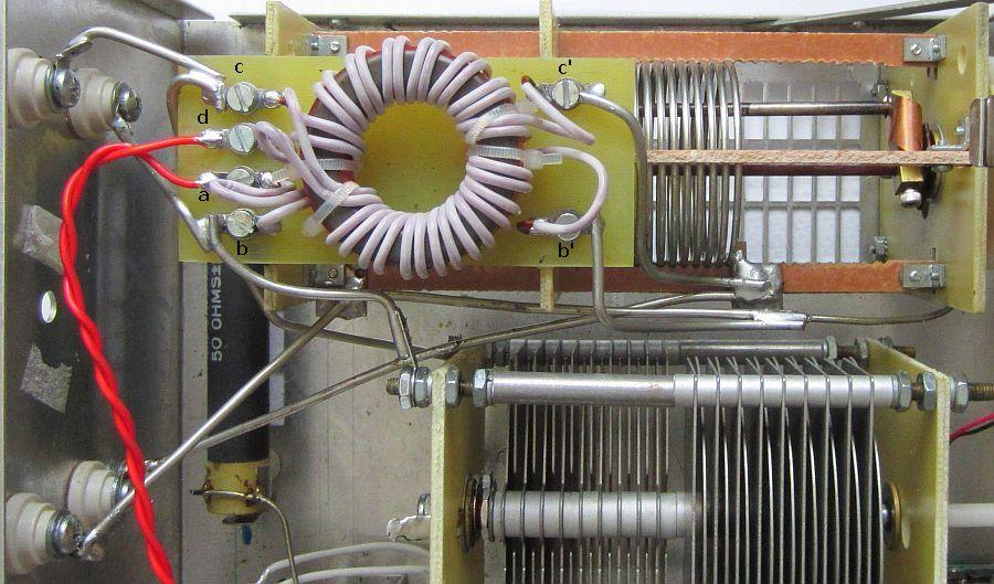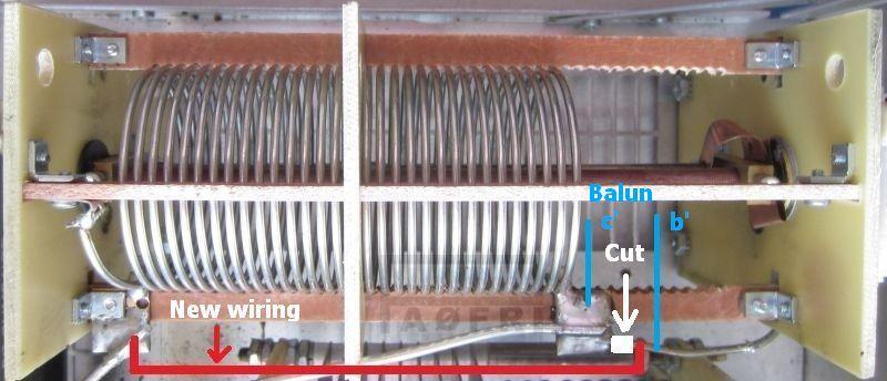 De balun wordt aangesloten zoals dat op de een van de bovenstaande foto's gemarkeerd is; zie ook #b' en #c' in de volgende afbeelding.