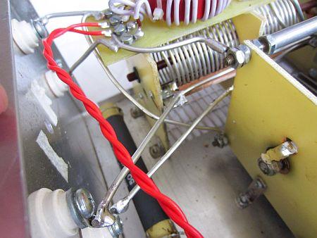 De aansluitingen van condensator (#e en #f) en rolspoel (#g en #h) worden elk met twee draden of lintlijn verbonden met een van de porceleinen antenne aansluitingen aan de achterkant van de kast.