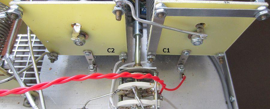 Door in serie sckakelen van secties wordt C2: 11.25 - 125 pF. C1 (45 - 500 pF) kan met de schakelaar parallel aan C2 gezet worden.