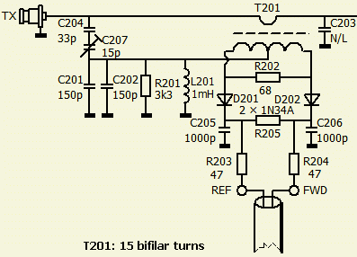 Bij iemand was de print gedeeltelijk verbrand, zodat van ringkern T201 weinig over was en het aantal windingen niet meer te bepalen was. Het lijkt mij dat een ferriet ringkern van mix 43 zoals FT#-43 met 15 bifilaire windingen een goede vervanger kan zijn. Na overbelasting is het mogelijk dat de 1N34A germanium diodes D201 en D202 beschadigd zijn: doorgeslagen of gedeeltelijk geleidend geworden. Met enig zoekwerk op internet is dat type of een andere germanium diode nog wel te vinden. Zo niet dan is een Schottky diode (b.v. BAT85) een mogelijkheid en SWR = 1 zal wel kloppen, maar de rest van de schaal is niet meer betrouwbaar.