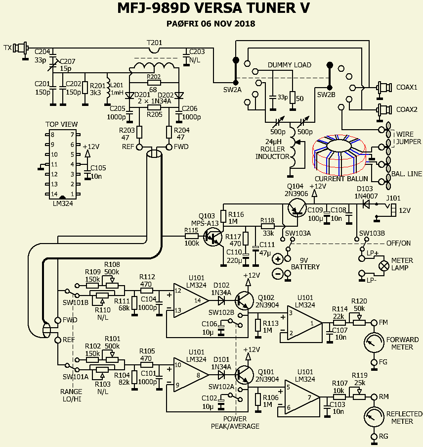 Het schema van een MFJ-989D ziet er zo uit: