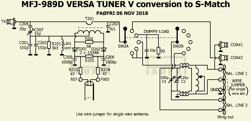 Een MFJ-989D met onbekende veranderingen en ontbrekende stroombalun werd ter beschikking gesteld om er "iets" van te maken. Een mooie gelegenheid om te onderzoeken of het geschikt was voor ombouw tot een symmetrisch systeem. Omdat de twee variabele condensators al standaard geïsoleerd van de kast gemonteerd waren, werd gekozen voor conversie naar een S-Match tuner.