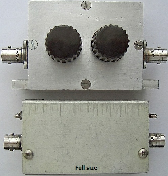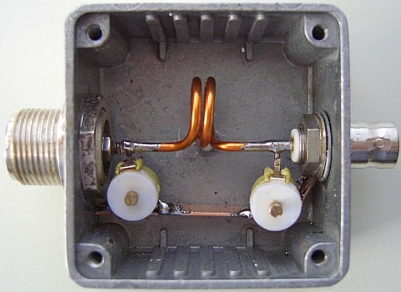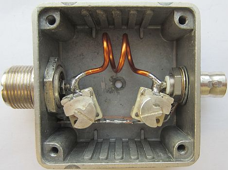 De schakeling kan ook dienen om een 50 Ohm coaxkabel aan te passen op 75 Ohm of omgekeerd. Het laatste type kabel heeft minder verliezen en dat wordt vaak vergeten. Als voorbeeld hoe dat te maken is, worden er twee spoeltjes getoond. Het kleine model is van 1 mm draad, heeft 4 windingen en is op een 5 mm boortje gewikkeld. Het grotere model is van 2 mm draad, heeft 2 windingen en is op een 10 mm boor gewikkeld. Voor een groter vermogen kunt u beter twee («fig) variabele luchtcondensatoren monteren. Bij de spoel in de rechter foto moest bij een overgang naar 75 Ohm de spatie iets vergroot worden. |