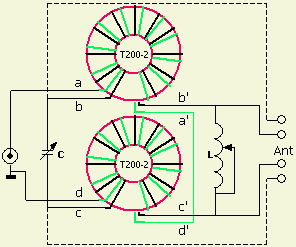 The transformer contributes a lot to the final result, which is my conclusion after I tested many types of windings. A couple of ham friends successfully tested a number of my own ideas for a suitable HF transformer/balun. The above chosen type of transformation ensures that input and output connections are galvanic isolated. The experiments show that an inductance of about 3 µH is a good compromise for all HF bands. Sometimes the minimum inductance (coil + balun) is too large for some 10-30 m antenna systems. Subsequently, extending or shortening the feeding line was necessary to change the antenna system impedance to cope with the tuner, or build a separate ATU with fewer turns e.g. less than 3 µH on the toroid.