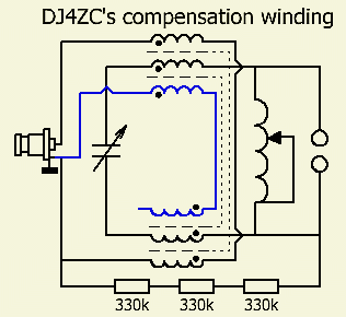 The RF transformer got an extra compensation winding, making it a trifilar system. The third («blue) winding is identical to the primary winding. However, the "hot" side is not connected to the 50 Ohm input, but connected to earth/ground and is therefore in the opposite phase. The other end is installed floating. Furthermore, the secondary windings are arranged between these two primary windings. With this method, the capacitive coupling of the secondary winding produces equal currents in the primary, but since they are opposite in phase, they cancel each other out. Thus, all "common-mode" noise picked up by the feeder line is largely suppressed for the receiver. On some bands, this measure At his location the noise level was reduced by around 20dB.
