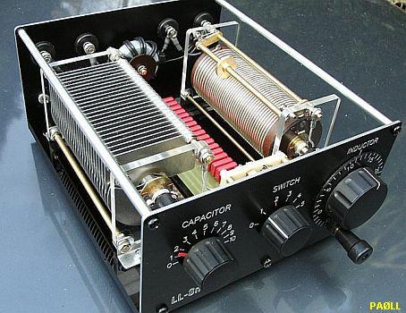 Kees, PAØLL who is famous for his LL-tuners, sent me photographs of his "LL S-Match". There was much demand for a small portable antenna system including a small ATU. For this reason his intention was to build and sell a handy ATU inclusive the antenna in a carry box. The final product is built with components, which are made especially for the tuner. C = 11 - 470 pF (knob with 1 :_6 reduction), L = 34 µH. The ferrite toroid for the balun was specially made by Amidon for this ATU. I expect that all his handcrafts made ATU's ends as "collector items"!