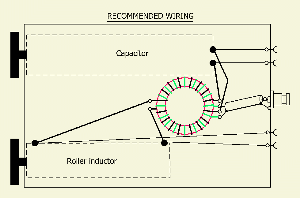 The use of a roller inductor enables tuning only by turning knobs. Some hams don’t like roller coils, not realising that a switched inductance with many taps has a lot more self-capacitance and self-inductance. Most of the time you can’t achieve a proper adjustment because the needed point is somewhere in between the taps. Still, I provide in this present application a switched inductance of 25 µH, which will be adequate for most of the antenna systems. An extra variable capacitor of 470 pF from a vintage AM receiver can be added in series with the input to help reducing the VSWR.