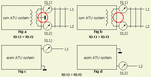 Always begin with matching the system for SWR = 1, to obtain maximum balance. Unbalance is usually the result of inaccurate tuning. With the usual baluns it may look as if the feeding line is symmetrical, but the centre taps of the bifilar and trifilar wound toroids force the balance with respect to "ground" or chassis (fig.a).