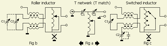 It was a simple matter to test the S-match out (fig») and then I proceeded to build it properly. Am using a Johnson 229-203 roller inductor 20 µH/5 A, a Jackson Brother 2 × 300 pF/1 kV variable capacitor and on 80 meters I add two 180 pF/2 kV Vitramon capacitors in parallel to obtain a match.