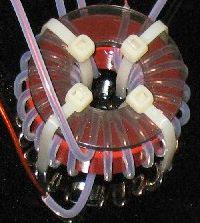 DL7RU has personally experienced that it is not easy to wind Teflon covered wire on a toroid and keep them firmly in place. DL7RU: I have now found a method to do the job much easier. First of all, I start with a couple of tight pulled cable ties on each side of the toroid. Under these ties I put smaller and thinner ones. This fixes the beginning and end of the windings so that it is easier to settle the wires.