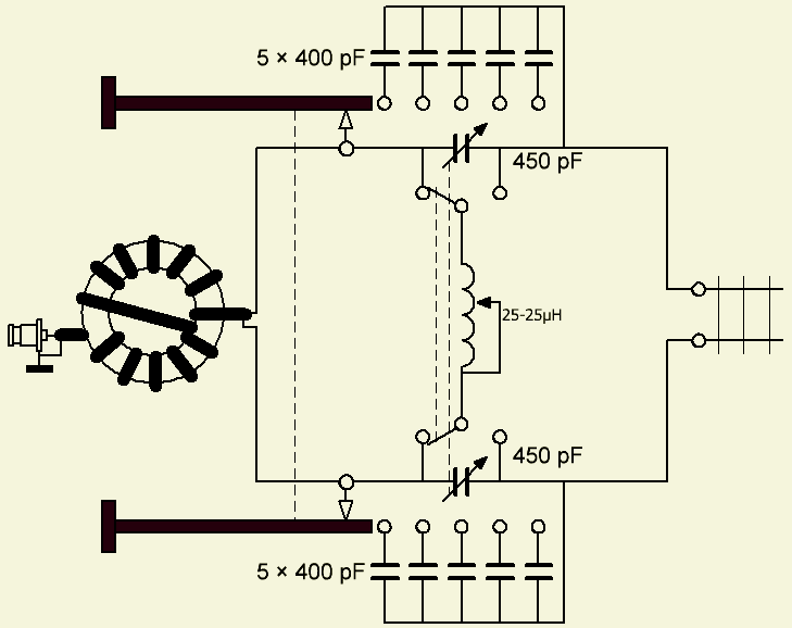 Wenst u een symmetrische antennetuner die vrijwel alles kan aanpassen van 10 t/m 160 m, dan is het beter om meer capaciteit ter beschikking te hebben. Bij een horizontaal raam van 4 × 40 m gevoed met open lijn, was het op de 160 m band zelfs nodig om 2 × 2400 pF erbij te schakelen om het geheel in resonantie te krijgen. De mooiste toepassing zijn twee vacuüm condensatoren van voldoende hoge capaciteit (fig»). Dat is een kostbare methode en het koppelen van zulke typen is ook niet gemakkelijk. Het bereik van minimum naar maximum capaciteit is veel groter dan dat van een gewone condensator met platen zodat er minder parallelcapaciteit geschakeld hoeft te worden.
