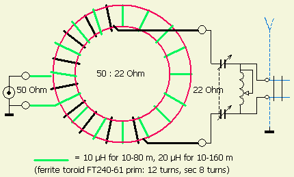 Met iets minder rendement kan men genoegen nemen met een 50 ÷ 22 Ω systeem. Het komt niet zo vaak voor dat een antennesysteem aangepast moet worden waarvan de impedantie gelijk of kleiner is dan 22 Ω. Men hoeft dan de condensators niet om te schakelen.