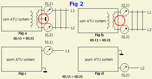 Zou men volgens figuren 2c en 2d een meting doen met een asymmetrische tuner beurtelings in elke voedingsdraad en vergelijkt men daarna beide stromen dan is het niet onwaarschijnlijk dat zij ongelijk zijn, bij voorbeeld IL1 > IL2. Dezelfde ongelijkheid zal men ook vaststellen met tuner fig 2b. Door het ontbreken van een kunstmatig midden van de uitgangsspoel is het verschil in stromen goed waar te nemen. Zo'n ATU is dus niet slecht maar geeft gewoon de feitelijke situatie weer. Met mijn S-Match ATU zult u dan ook veel sneller een onbalans in de voedingslijn waarnemen dan de met vele andere antennetuners.