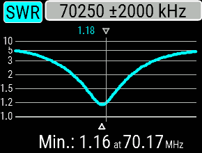 With a coaxial cable to the shack one floor below and a SWR meter between set and cable, the resonance was slightly shifted to 70.17 MHz with a SWR = 1.16.