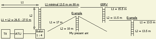 Helaas wordt bij gepubliceerde lengtes nooit vermeld of een afmeting geldt voor de draad (L3) tussen balun en trap, tussen trap en isolator en of de gevouwen stukken (L1, L2) deel uitmaken van de opgegeven maat. Verder is het van belang of er ongeïsoleerd of geïsoleerd draad werd toegepast.