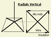 Een verticale antenne met twee radialen die 180° uit elkaar liggen is een effectieve antenne. Het systeem is gebaseerd op patenten uit 1933 en 1934. Een vereenvoudigde formule voor het voedingspunt is: R = 18(1 + sin ß)² ß is de hoek van de radialen ten opzichte van het horizontale vlak. Als ß = 0° wordt R = 18(1 + 0)² = 18 Ohm en als ß = 42° wordt R = 18(1 + 0.67)² = 50 Ohm met ß = 90° wordt de antenne een dipool met R = 72° |