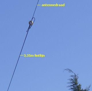 Het is een halve golf straler die met behulp van een HF trafo (1 : 49) aan het begin (of einde) gevoed wordt.