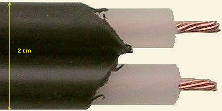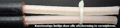Volgens de fabrikant kan de kabel (fig») net zo aangelegd worden als coaxkabel. Dat is voor zendamateurs in een flat of appartement een mogelijkheid om hun antenne met een symmetrische lijn te voeden. Een stuk van deze "lintlijn" is door mij voor de foto ontdaan van isolatie en u kunt zien dat het lijkt op coaxkabel zonder afscherming. Op aandringen van een collega zendamateur schijnt de firma RYS een beperkte voorraad in Duitsland besteld te hebben.