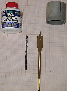 Grijze installatiebuis 5/8" (16 mm) Afvoerbuis dikwandig 50 mm dia. Houtboor 5 mm met centreer punt Houtboor 16 mm Half ronde vijl. Busje hard pvc lijm. Schuurpapier. Tyraps |