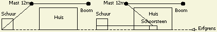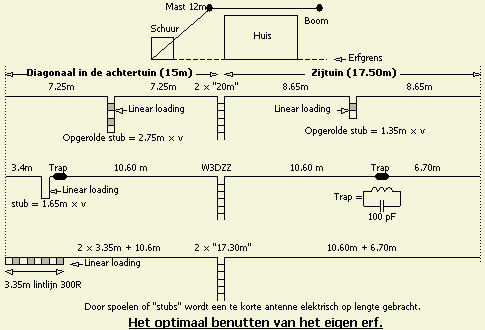 Hier volgt een voorbeeld hoe op mijn erf de ruimte zo goed mogelijk gebruikt werd met diverse inverted V antennes aan een 12 m lange mast. Diagonaal in de achtertuin is ruimte voor ongeveer 14.5 m draad. Voor afspannen en isolator is dan nog 0.5 m over. Voor de andere helft van de dipool is er in de zijtuin maximaal 17.30 m ter beschikking. Er is dan nog plaats voor afspannen en isolator.