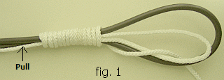 (1) Maak een lus van binddraad (fig1) met beide uiteinden naar links. Windt één einde stevig om de antennedraad en steek dat dan door de lus.