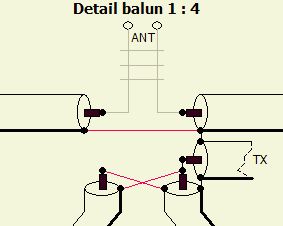 Mijn bouwsel (voor binnenshuis zie boven) wijkt af van het door PAØSE gepubliceerde model. Het een en ander was het resultaat van experimenteren nadat een artikel in Technical Topics in RadCom van RSGB gelezen was. Het is frappant dat onafhankelijk van elkaar beide constructies hetzelfde geworden zijn. De kabels (RG-213/U) zijn tegendraads gewikkeld op een 12.5 cm diameter vorm en naar binnen gebracht op zodanige wijze dat alle uiteinden zo dicht mogelijk bij elkaar uitkomen. Dat laatste bevordert de symmetrie in hoge mate en vermindert de toegevoegde zelfinductie van de onderlinge verbindingen. De punten van lage impedantie liggen bij elkaar en van hoge impedantie met lange toevoerdraden uit elkaar. Met het nadeel van langere verbindingen kunnen de spoelen kunnen ook op twee aparte kokers aangebracht worden.