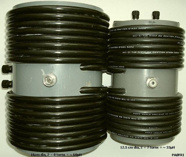 RG213: ± 60 µH = 2 × 8 windingen, pijp 16 cm Ø en ±33 µH = 2 × 7 windingen, pijp 12.5 cm Ø,. |