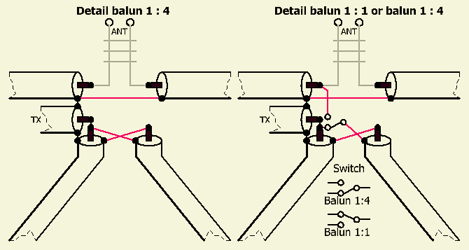 Het systeem bestaat uit twee gelijke lengtes coaxkabel (fig») die aan de ene kant parallel en aan de andere kant in serie geschakeld zijn. Met 50 Ω of 75 Ω coaxkabel betekent dat er een transformatie plaats vindt van respectievelijk 25 Ω : 100 Ω en 37.5 Ω : 150 Ω.