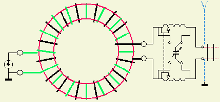 Door het experimenteren met baluns voor mijn S-Match antennetuner ben ik overgegaan op een afwijkende manier om de ingang van een symmetrische ATU te voeden. De primaire en secundaire spoel zijn gelijk maar volgens de tekening op een andere manier op de kern aangebracht. Het aantal windingen hangt af van het kernmateriaal; de zelfinductie op de laagste band moet ten minste 20 µH/160 m, 10 µH/80 m etc. zijn.