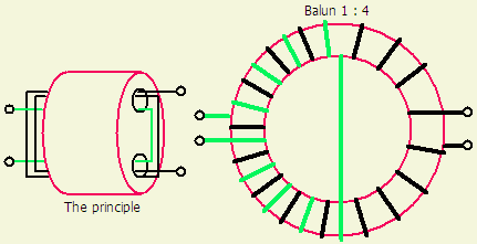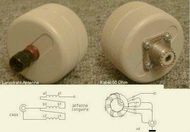 Een 1 ÷ 9 transformator («fig) voor een magnetische balun antenne vond ik op internet. De trafo is gemaakt met een rode Amidon T130-2 ringkern. Het rendement van het antennesysteem is twijfelachtig met zo'n kleine kern waarop niet veel windingen passen. Als in plaats van de balun een 50 Ω weerstand wordt geplaatst met hetzelfde stuk draad, dan heeft u waarschijnlijk een even effectieve antenne. Als u dat niet gelooft moet u het eens proberen. De weerstand neemt bijna al het vermogen op maar de draad straalt en tegenstations kunnen u ook nog horen. Rechts ziet u een militaire uitvoeringvan een choke balun.