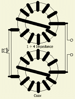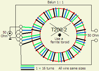 Een 1 : 1 balun met ringkern of ferrietstaaf kan gemaakt worden volgens de tekeningen. Ook hier geldt dat de impedantie van de spoelen aan de in en uitgang tenminste 5 × 50 Ω dienen te zijn. Er staan aan iedere kant van de ringkern 2 × 16 windingen is serie en met bovenstaande formules betekent dat voor een T200-2 kern maar 12.3 µH parallel aan de in en uitgang van de 50 Ω belasting. U kunt nu zelf uitrekenen of dat echt wel genoeg is voor 10–80 m of dat toch maar een (ferriet)kern met een hogere permeabiliteitfactor ingezet moet worden.