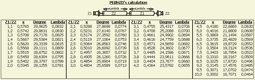 The system is based on a complex formula L = [arctan(sqrt (B/(B ^ 2 + B +1)))]/(2.pi), B = Z1/Z2, that can be found on the Internet together with the associated graphics. For the DIY builder the graph below is clearly enough to get started. The adjustment is quite wide-band and in principle coaxial length of one-twelfth wavelength should be sufficient, but according to the formula the matching is optimum if the length is calculated on the basis of the transformation ratio.