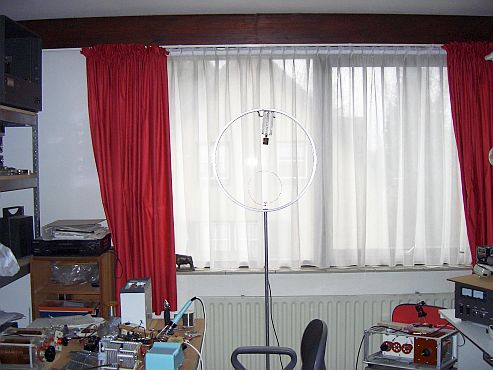 Als in mijn kamer de resonantie en de grootte van de koppeling bepaald werd met de loop loodrecht op richting van de betonnen platen van vloer en plafond, dan bleek dat buiten weinig verstemming had plaats gevonden. Als binnen de antenne 90° gedraaid werd, was de SWR zeer groot en moest de afmeting van koppeling drastisch veranderd worden om dat omlaag te krijgen. Het metaal dichtbij de antenne heeft dus sterke invloed op afstemming, grootte van de koppellus en Q van de kring.