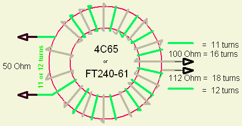 Aanpassing van 110 of 100 Ω naar 50 Ω kan met een balun of symmetrie trafo (fig»). Door veel te experimenteren met mijn S-Match antenne tuner ben ik op deze manier van wikkelen voor een balun gekomen. Een groot voordeel is de volledig galvanische scheiding van in - en uitgang. Een koppeling van een dipoolhelft met de afscherming van een coaxkabel is daarmee vrijwel gereduceerd. Controleer of, door het omwisselen van de aansluitingen aan de in of uitgang, de symmetrie beter wordt.