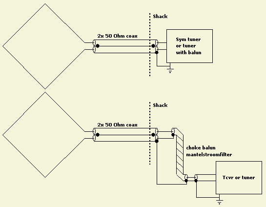 Hier («fig) is alles nog eens verduidelijkt. Ook een (interne) asymmetrische tuner in combinatie met een mantelstroom filter is meestal mogelijk. Wikkel voor 10 t/m 80 m ongeveer 3 m coaxkabel op een (PVC) buis van 7–10 cm doorsnede. Als de tuner geen aanpassing kan vinden, de voedingskabel (2 × 50 Ω) verkorten of verlengen.