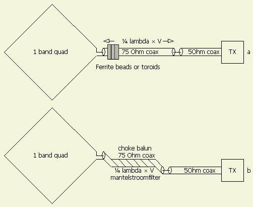 Een quad voor één band is op eenvoudige wijze (fig a) aan te passen met een 75 Ω coaxkabel. De afmeting moet ¼ golflengte maal de verkortingsfactor (V) van de kabel zijn, ¼ × V × λ. De 50 Ω impedantie van de voedingskabel wordt door dat stuk opgetransformeerd naar 112.5 Ω. Want Zant × 50 = 75² zodat Zant = 5625 ÷ 50 = 112.5 Ω.
