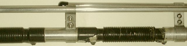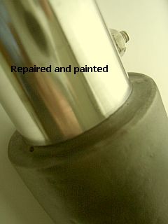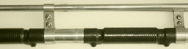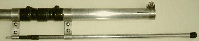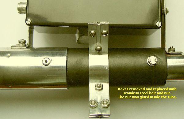 Door het uitboren van een popnagel kon de antenne uit de isolator gehaald worden. Het probleem was: hoe moest de antenne weer rechtop in de te ruime isolator vastgezet worden, want een scheve antenne is geen gezicht. Na het overwegen van (voor mij) ingewikkelde mechanische hulpmiddelen werd eerst een gemakkelijke methode geprobeerd. Aan de binnenkant van de isolator bracht ik met een kwastje een dunne laag twee componenten polyesterhars aan. Steeds werd na het opnieuw aanbrengen en uitharden van een dunne laag gecontroleerd of de staaf zonder speling in de buis paste. Eventueel werd de cilindrische vorm hersteld door de binnenkant te ruimen met een strook schuurpapier om een dunnere buis. Dat bleek goed te werken en toen alles mooi in één lijn in elkaar schoof, werd de antenne definitief met polyesterhars in de isolator gelijmd. In de plaats van de popnagel kwam een RVS bout en moer. De laatste werd eerst met polyesterhars aan de binnenkant van de aluminium buis gelijmd.
