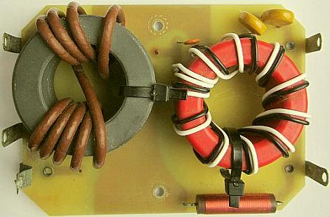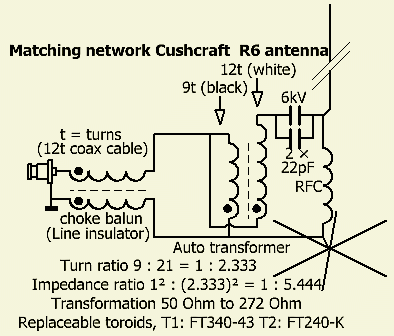 De auto transformator van een R6 is anders. De witte draad gaat 12 keer door de kern en de zwarte draad 9 keer. De ingang (50 Ohm) aftakking is op 9 windingen van een spoel met 21 windingen. De transformatie verhouding wordt dan 1 ÷ 5.444. De 50 Ohm wordt dus getransformeerd naar 50 × 5.444 = 272 Ohm.