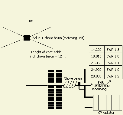 Deze antenne was de mindere vergeleken met mijn 2 el yagi, tenminste als de beam in de richting van het station gericht werd. Meer dagelijkse ervaring en vergelijking ontstond door vergelijking met een W3DZZ als inverted V en gevoed met openlijn. Op de onderstaande foto is net het bovenste deel van deze antenne te zien. Binnen Europa, op een afstand tot aan de middellandse zee, is meestal de W3DZZ iets sterker, maar dat hangt ook van de condities af want soms is de R5 beter. Als het tegen station ook een verticale antenne heeft, geeft de R5 qua zenden en ontvangen een evengoed of sterker signaal. Met DX zijn beide antennes gelijk en het verschil kan door condities in een tijdsbestek van 5 minuten wisselen; dan is weer is de ene en dan weer de andere antenne sterker.