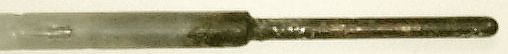 De verwoestende uitwerking is hiernaast zichtbaar. Over een paar cm was de kunststof weggebrand en door verhitting gedeformeerd en aan het metaal vast gesmolten.