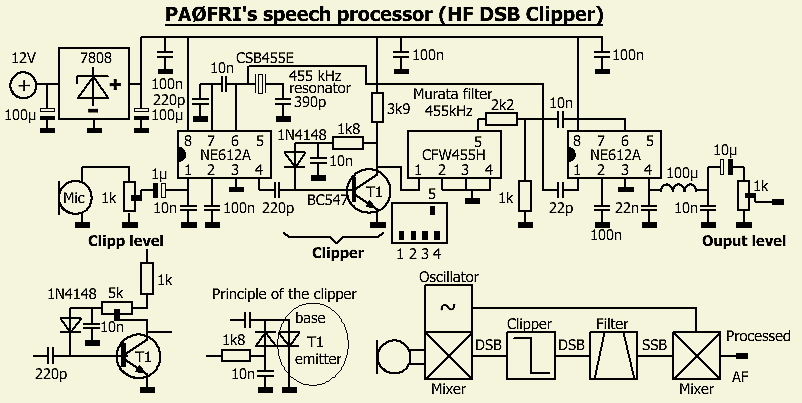 The DSB limiter in my original article (see at the bottom) gave problems for some foreign home brewers. Probably by using a different type of IC (eg TBA120S, TBA120AS, TBA120T, TBA120U) than the previous model (TBA120, TBA120A) which was used in my circuit. Moreover, the older types are difficult to obtain. Reason why I started experimenting with readily available mixer NE612A (or SA12AN). This experimental version («fig) of a speech clipper, one of the many tested designs, worked satisfactorily. See also Atlas speech processor.